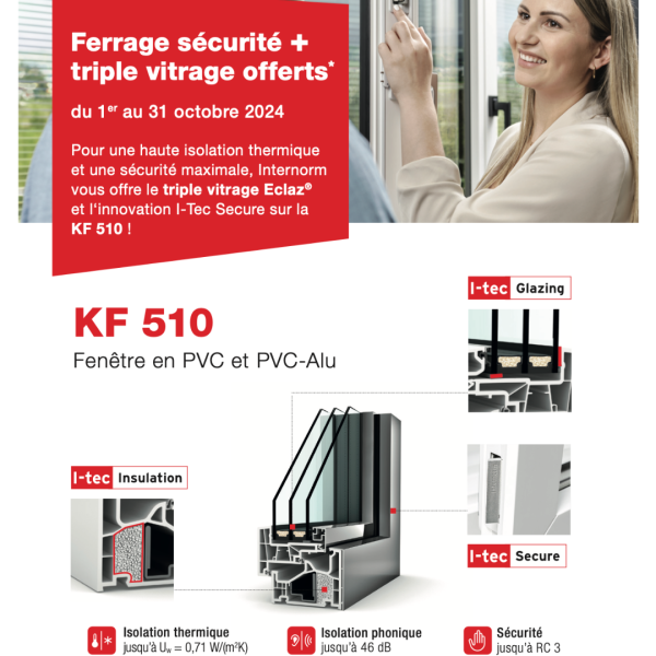 Nous vous offront le triple vitrage ECLAZ sur le modèle KF 510 ainsi que l’option I-Tec Secure pour une protection renforcée. Et ce n’est pas tout ! Pour cette PROMO INTERNORM D'OCTOBRE 2024, le triple vitrage est offert.